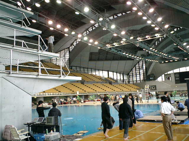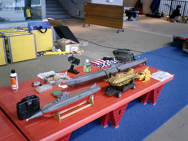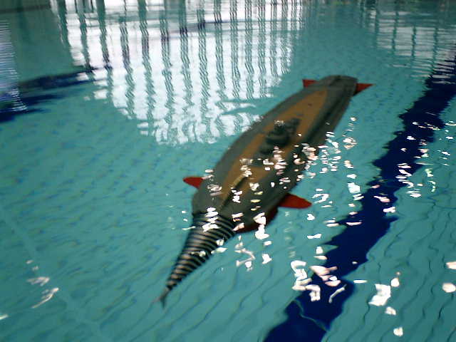 家のお風呂で、浮力&バランス調整を行なって、(前進・後進)走行の動作確認レベルしか できていませんので、'07水中ロボットコンベンション(2007.03.24)に参加した際に、無謀 にも、国際競技会場の公式プールで、海底軍艦(轟天号)の試運転走行を行ないました。