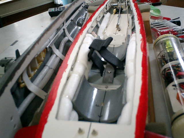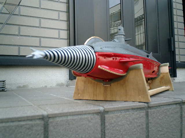 ●完成です。 強度的に弱い特性のソフトビニール(船体)に対して、骨の様に、アルミ板などで強度補強 し、フランケン(継ぎはぎ)化での完成となりましたが・・・ これも有りかも (^^;
