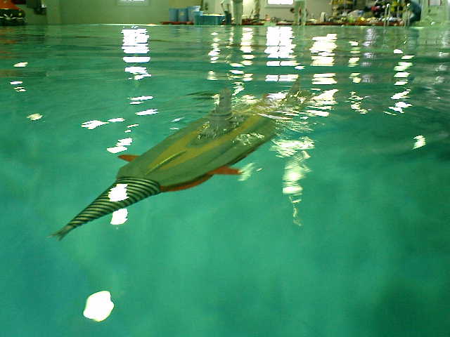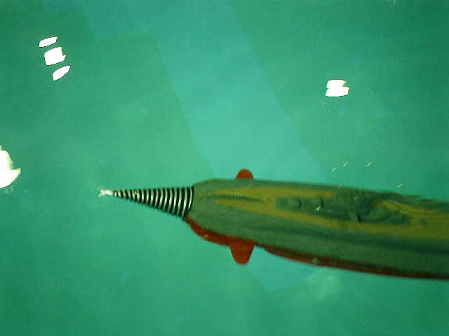 今回のデモ&テスト走行では、自力潜航できませんでした(1回だけ成功)ので、完全潜水 状態してから、手投げでの潜航走行始動を行いました。これには、まいりましたです。(^^;