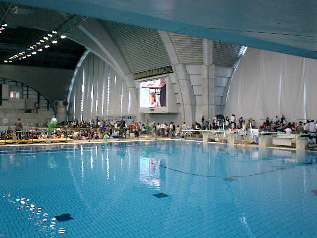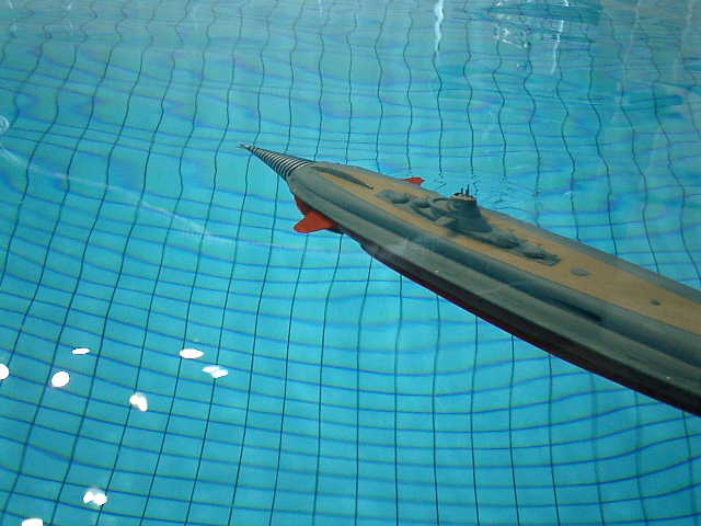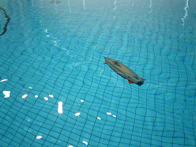 ●フリースタイルの時間帯に走行させますので、バランスチェックです。 この使用プールで以前に走行させた時は浮力が弱かったのですが、今回は、浮力が多少強 い感じですので、神戸市立フルーツ・フラワーパークのプールで走行させた時と、同様に オモリを追加(約25グラム)して、中性浮力に近いセッティングを行ないました。
