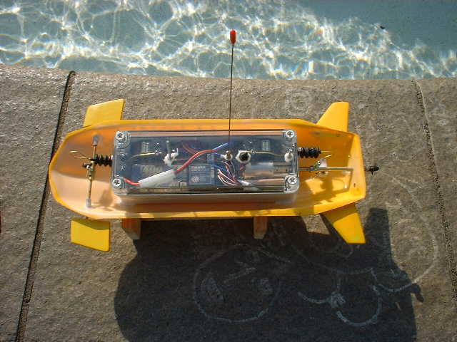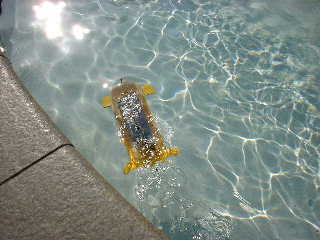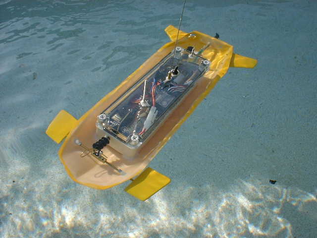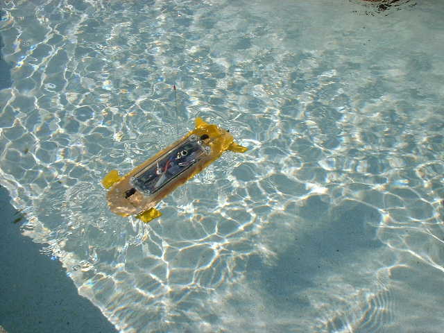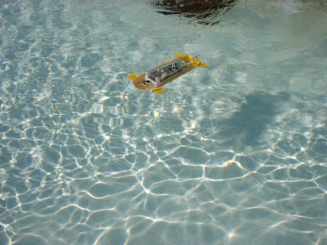 バランス調整ができていないが、それでは、発進してみよう。 ■船体の下部のみで、走行しているではないか! ふ〜ん あら感心! ■潜航できたみたいだが、コントロールが難しい。やはりバランス調整が必要っか・・
