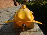 前部は、いかにも潜航しそうなボディ形状しており、潜航時に、水の抵抗を強く受けている みたいである。船体上部を装着して走行した場合、まるで別物だな〜 コントロールが難しいのは、組み立て説明書と違う事をやってしまったのが、原因かな? ■スタビライザー 船体下部の後部に付けているスタビライザーは、説明書では、下向き(約30度)にな っていたが、ほぼ水平状態で付けてしまった。 ■船体下部の水抜き穴 水の出入り用の穴は、説明書では、左(6個)/右(6個)開けるようになっていたが まったく開けなかった。 ■船体上部のアンテナ/スイッチ穴 説明書では、2p X 4pの穴を開けるようになっていたが、大きめに開けてしまった。