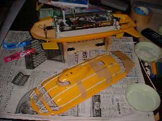 ■船体の中に水流を通すために、船体上部の前部/後部をカッテイングした。 → これにより、水の抵抗を弱める事ができ、コントロールできるのでは! ■白い棒は、意味もなく付けている。 ちょっとは ましかな〜