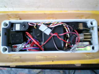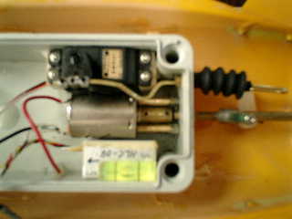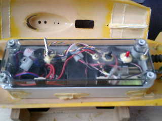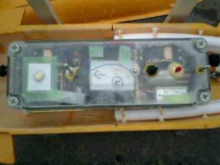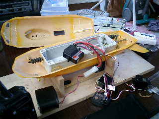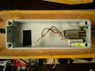 → 約15分程度の走行でしたがハル(上部)が外れずに、ちゃんと固定されている。よ〜し! → しかしながら、スピードが出ないのは、スクリュウ(2枚ペラ)が、小さいからだろうな〜 ■メカボックス内の確認です。 ↓