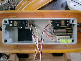 → 前進時のスクリュウ(左)回転に合わせて、線(+−)は、逆に継ぎました。 → なぜか、スピードコントローラーの設定も、前進/後進が、逆なんだな〜 まっ、いいか! → おっと! 潜舵用のサーボ交換を忘れているので、ピッチコンの結線が必要だった! ■ピッチコンの結線。 ↓