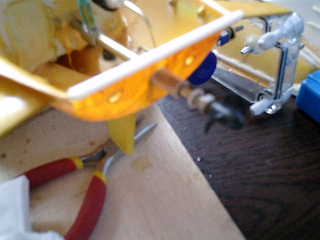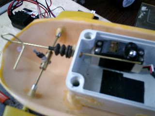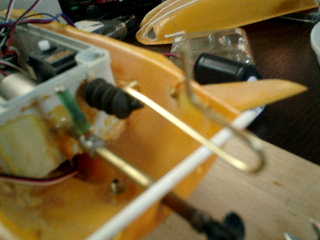 → 潜舵ロットと同様に、手曲げは、とても難しい! ■舵ロットを抜いて、サーボ側に合わせて、真中丸棒(2mm)を、曲げてから、再度、穴から通す。 ↓