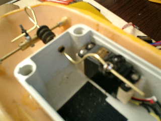 ●潜舵ロットの作成 ■潜舵側ホーンに合わせて、真中丸棒(2mm)を、U字に曲げてから、防水ブーツの穴から通して調整する。 ↓