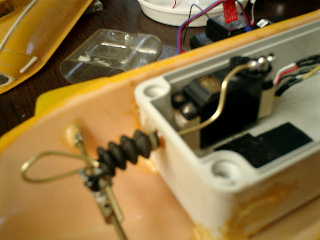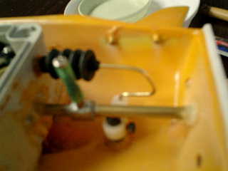 → 曲げてからの防水ブーツ穴へ通すのは、とても大変です。 ふぅ− ■潜舵ロットを、アジャストストッパーで、双方(潜舵側/サーボ側)を止める。 ↓