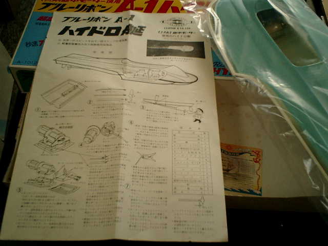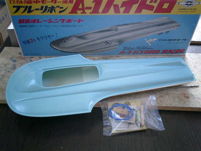 昔物のキット商品'ブルーリボン A−1 ハイドロ(クリッパー商会製)'で、当時物の特 殊な空中モーター( マブチA-1 )を搭載して走行させる超高速レーシングボートです。 NO.108 BLUE RIBBON A-1 Hydro