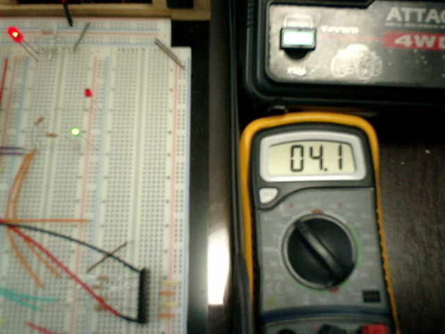 → 緑色LED点灯! 4.1Vです! オーバーしている! う〜ん・・・