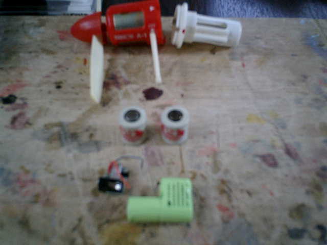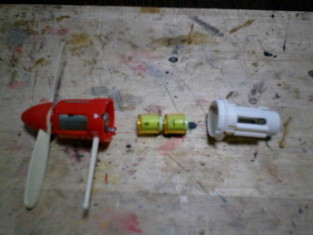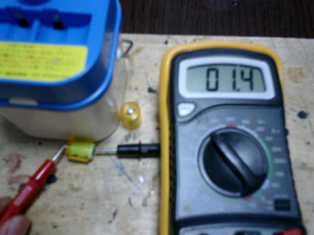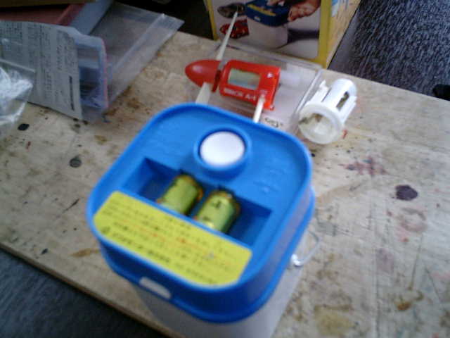 やはり、年代物のスーパーセルは劣化していますし、入手が困難な状況ですので、これに変 わり、サンダーバード4号で使用したRC機器(インドアレーサー)の残り物で小型の充電 池(ニッケル水素120mAh)を使用して、スーパーセルの代替物を作ることにしました。