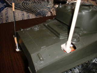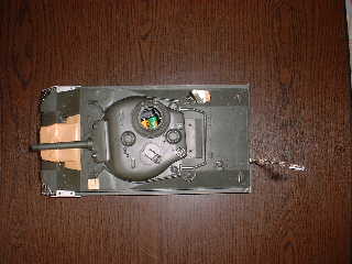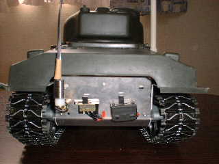 車体の後部(右側)を、トランスミッターのアンテナを出すために、穴を開けています。 全体的に、シンプルなデサインで、戦車らしいと思います。 車体の後部に、2つのスイッチを付けています。 ■左側 : CCDカメラ&トランスミッター(送信機)用 ■右側 : 車体のモーター/DMDコントロールユニット/受信機/送信機用