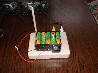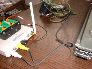 ●写真(左) ・映像受信機のコネクター部分です。 ・黄色 : VIDEO出力です。 ・白色 : 音声出力です。 ・ポータブル・テレビへ継いでいます。