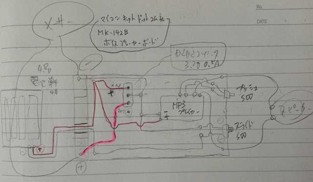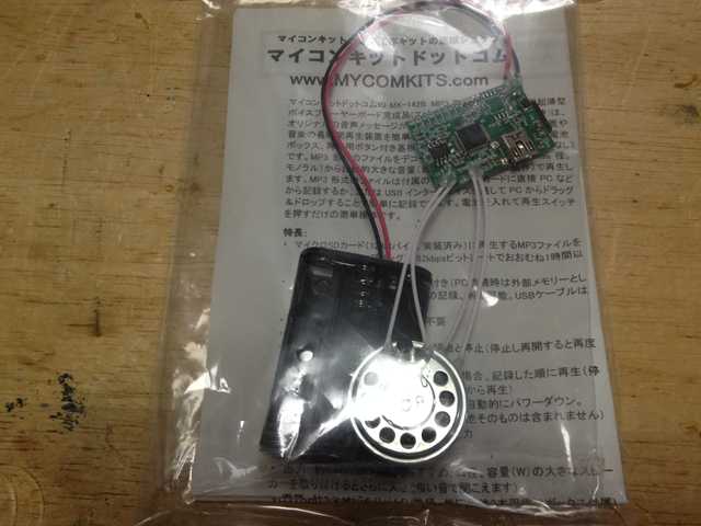 ・マイコンキットドットコム社 MK-142B MP3 再生可能!組込み用超薄型ボイスプレーヤーボード ・電源 : 約2.5V〜5.5V(4.5V推奨) ・消費電力 : 再生中約200mA(音量に依存)、停止中約5mA ・単4乾電池(3本)の使用で、サウンド出力できましたが・・・ → 充電池では、ダメでした・・・ 電圧不足かしら (^^?