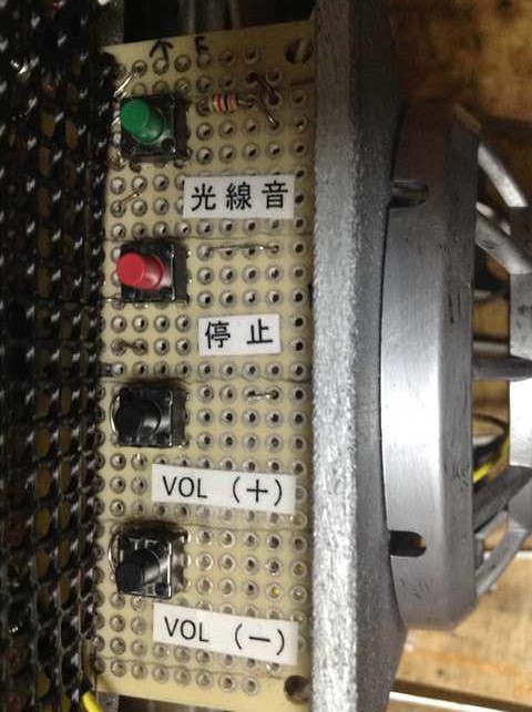 ●microSDメモリーカードに記憶するもの(14曲) −ADKEY1系− ・ファイル1 : 無音 ・ファイル2 : Aサイクル光線 −ADKEY2系− ・ファイル14 : 怪獣島 探検車 ASHI32 走行 ・ファイル13 : パリは燃えているか ASHI322 走行 ・ファイル6 : ウルトラQ 走行 ・ファイル5 : エレクトリカル パレード・ドリームライツ 走行 *他は、ダミー(無音)を記憶する。… ファイル3、4、7〜12 -------------------------------------------------------------------------------- 【左側】ボタンエリア @黄色 :【 怪 獣 島 】……… ファイル14 (200kΩ) A白色 :【 ASHI32 】……… ファイル13 (100kΩ) B水色 :【 ウルトラ 】……… ファイル6 (3kΩ) C橙色 :【 パレード 】……… ファイル5 (0Ω) -------------------------------------------------------------------------------- 【右側】ボタンエリア D緑色 :【 光線音 】………… ファイル2 (3kΩ) E赤色 :【 停止 】…………… ファイル1 (0Ω) F黒色 :【 VOL(+)】 G黒色 :【 VOL(−)】 --------------------------------------------------------------------------------
