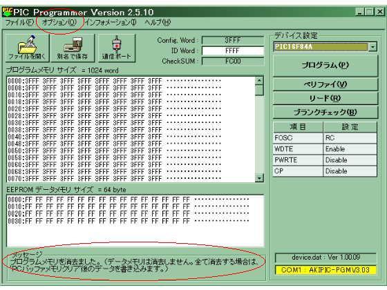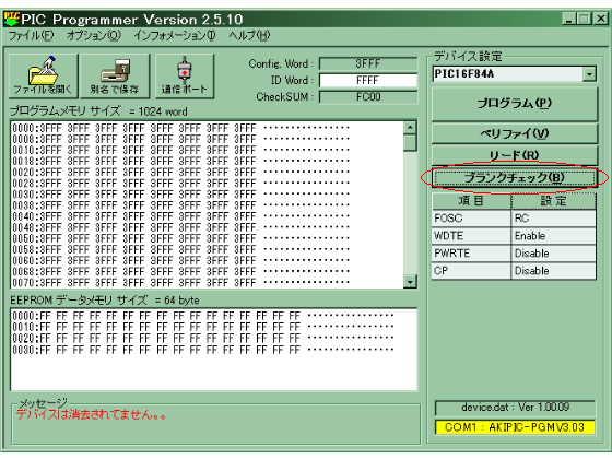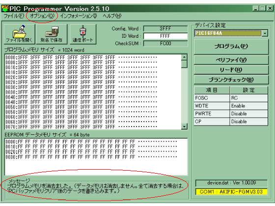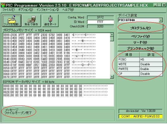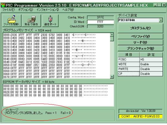 ↑ この状態で、 OKです。 ↑ ・メッセージ : PIC16F84A OK ・COM1 : AKIPIC-pgmv3.03