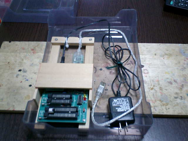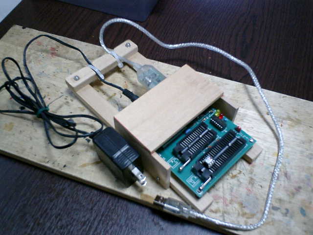 PICライターに接続する電源コードとUSB・シリアル変換ケーブルは、接続近くのケー ブル部分を枠台に固定して安定接続の維持を図り、PIC(プログラムを書き込むもの)を セットする際には、ゼロプレッシャーのバーを、上下げの動作が必要ですので、この部分は オープンにして、お手軽に木材を使用して簡易的な枠台を作りました。