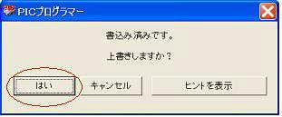 ↑ この状態で、 OKです。 ・メッセージ : プログラミング成功 ●書き込み済みのPICの場合、この画面が表示されます。 上書きしますので、(はい)ボタンを押します。