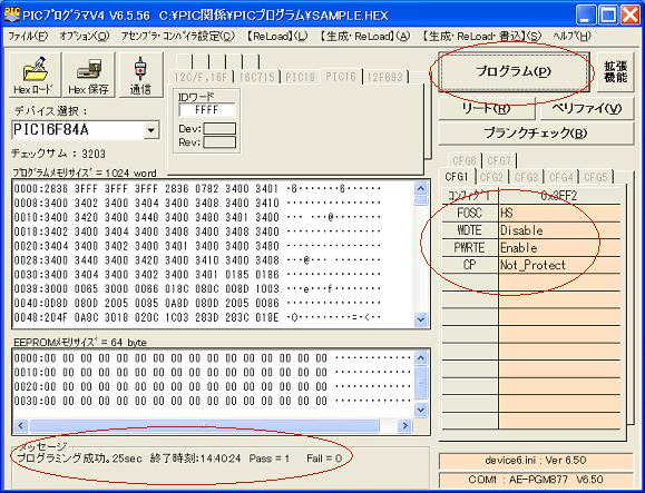 ↑ この状態で、 OKです。 ・メッセージ : PIC16F84A OK ・COM1 : AE−PGM877 V6.50