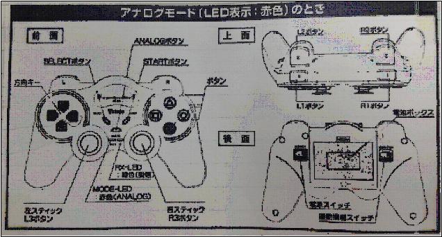 ●ボタン情報(2バイト) ------------------------------------------------------------------------------ ・バイト4 DAT応答電文 ボタン区分 ボタン 'FF' → 40 : 押下なし ………【左側】エリア・【中央】エリア 'FE' → 41 : ← ………………【左側】エリア 'FD' → 42 : ↓ ………………【左側】エリア 'FB' → 43 : → ………………【左側】エリア 'F7' → 44 : ↑ ………………【左側】エリア 'EF' → 45 : START ……【中央】エリア 'DF' → 46 : R3 …………… スティック【右】ボタン(アナログモード時のみ) 'BF' → 47 : L3 …………… スティック【左】ボタン(アナログモード時のみ) '7F' → 48 : SELECT …【中央】エリア ------------------------------------------------------------------------------ ・バイト5 DAT応答電文 ボタン区分 ボタン 'FF' → 50 : 押下なし ………【右側】エリア・【前側】エリア 'FE' → 51 : □ ………………【右側】エリア 'FD' → 52 : X ………………【右側】エリア 'FB' → 53 : ○ ………………【右側】エリア 'F7' → 54 : △ ………………【右側】エリア 'EF' → 55 : R1 ……………【前側】エリア 上段(右) 'DF' → 56 : L1 ……………【前側】エリア 上段(左) 'BF' → 57 : R2 ……………【前側】エリア 下段(右) '7F' → 58 : L2 ……………【前側】エリア 下段(左) ------------------------------------------------------------------------------