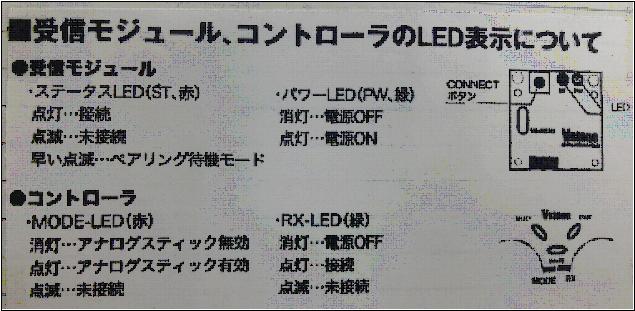 ●初回起動時のみ ……… レシーバとコントローラ間のペアリング設定が必要です。 ■レシーバ(受信機) …………… [VS-RCV3] 側 ・電源をONする。 ・【 CONNECT 】ボタンを押下する。 ・赤LEDが点滅する。 ■コントローラ(送信機) ……… [VS-C3] 側 ・電源をONする。 ・【 ANALOG 】ボタンを押下する。 ・赤LEDと緑LEDが点滅する。 ■点滅している双方のLEDが、点灯に変われば、ペアリングは完了です。 *電源を切っても、一旦設定したペアリング設定は消去されないが、 非ペア双方の間で、新たにペアリングすれば、その設定が記憶される。