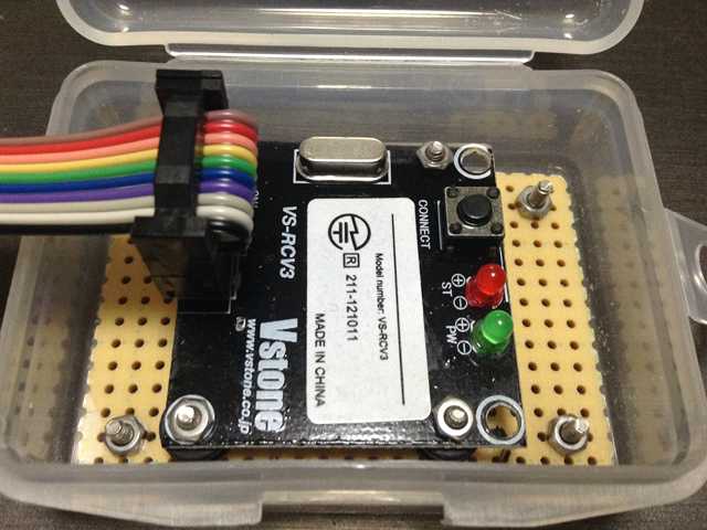 ●レシーバ(受信機)単体では、壊しそうなのでケースに入れました。 フラットケーブルを外方向に向けて、コネクタ接続しました。