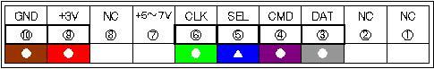 ・黒 : @ : NC ・白 : A : NC ・灰 : ○ B : DAT ・紫 : ○ C : CMD ・青 : ○ D : SEL ・緑 : ○ E : CLK ・黄 : F : +5〜7V ・橙 : G : NC ・赤 : ○ H : +3V ・茶 : ○ I : GND