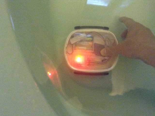 ●水中設置環境下での受信機の接続確認です。 お手軽に、パッキン装備の弁当箱の中に受信機類を入れて、お風呂で確認します。
