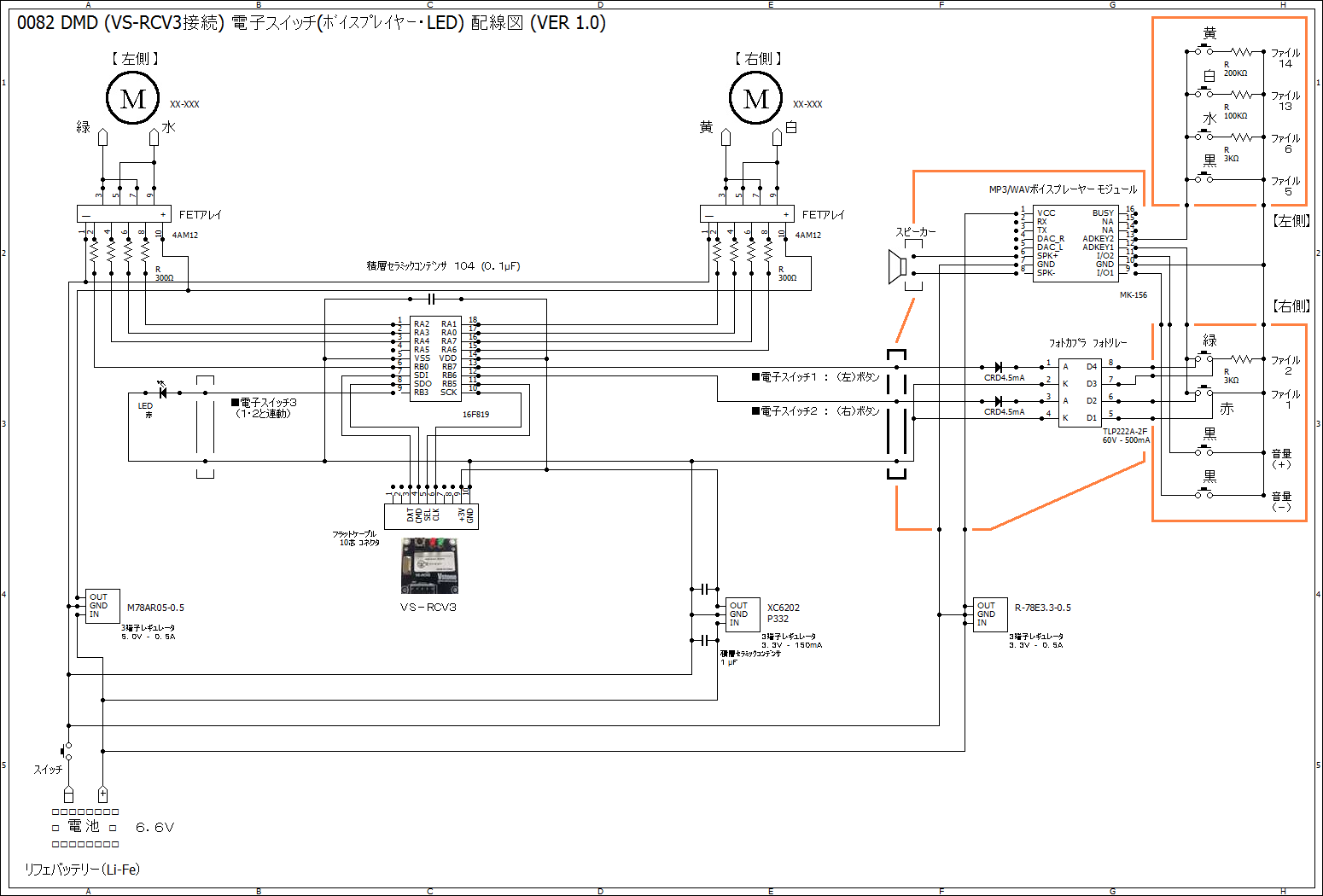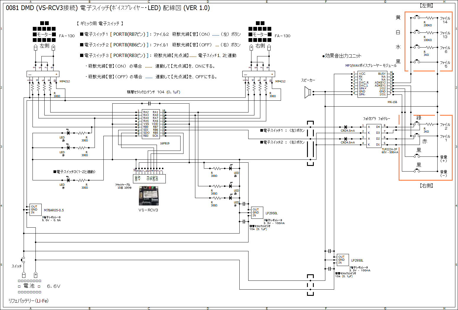 ●配線図です。……… クリックすれば、拡大します。-------------------------------------------------------------------------------- ・プログラム:VSC3DMD08( VER 0800 ) * ボタン入力によるスイッチ設定を調整した。 -音ON- -音OFF- 状態 LED点滅 電子スイッチ1 電子スイッチ2 ------------------------------------------------------------------------- ■(左側)ボタン : 初期 OFF OFF OFF (ON) : 押下 【ON】 【ON】 OFF : 放す OFF OFF OFF *1【ON】 *1 押下してから、直後に放した場合 …【ON】状態を継続する。 OFFにする場合は、(右側)ボタンを押下する。 ------------------------------------------------------------------------- ■(右側)ボタン : 初期 OFF OFF OFF (OFF): 押下 OFF OFF 【ON】 : 放す OFF OFF OFF --------------------------------------------------------------------------------