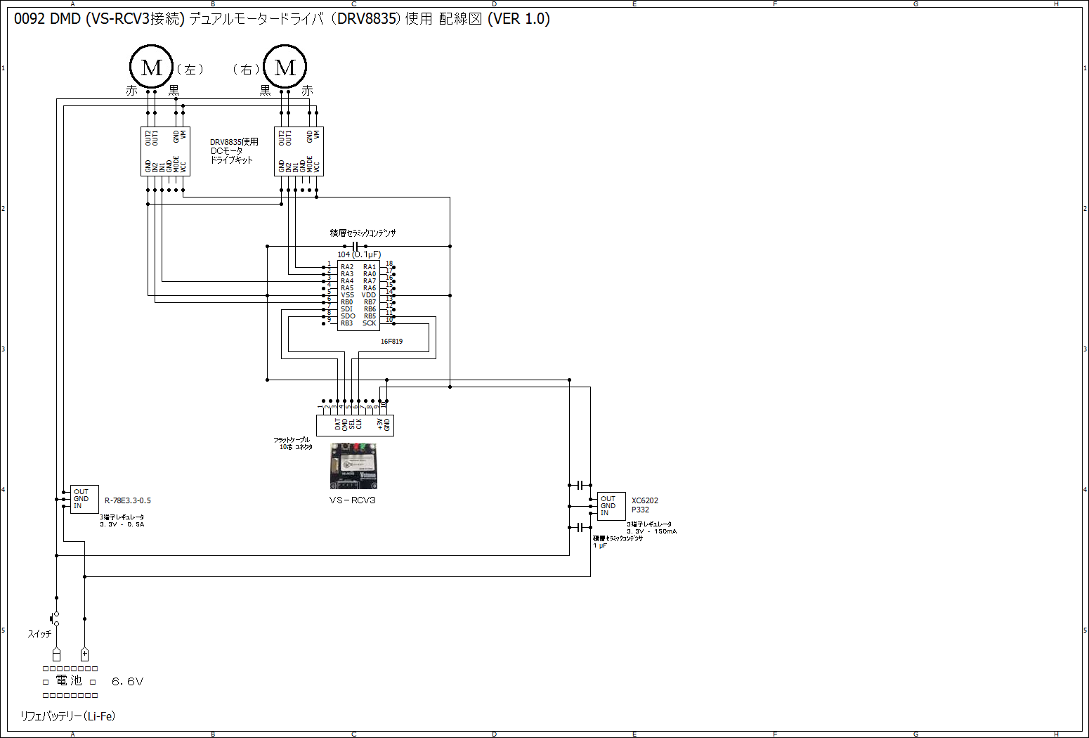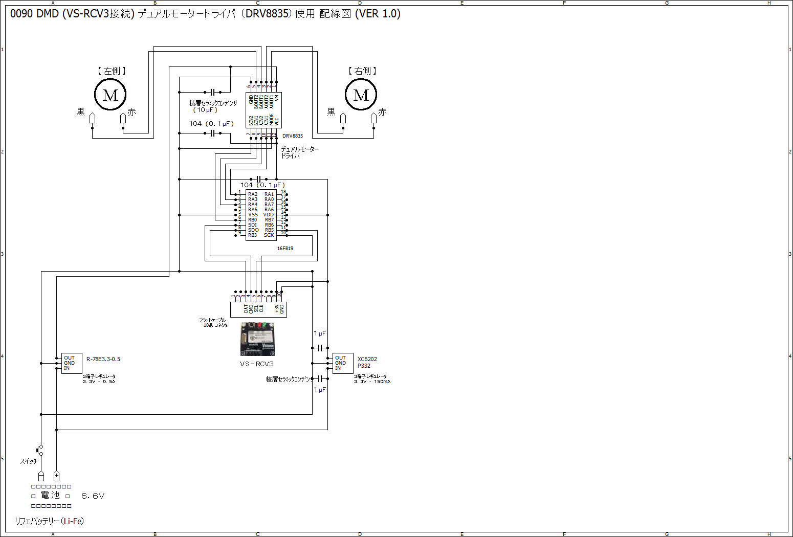 ●デュアルモータードライバ ( DRV8835 ) の試行です。 「 DMD(VS−RCV3用) 実装A 電子SW 付加 」の仕様をベースにします。 ・配線図です。……… クリックすれば、拡大します。・電子スイッチと接続する機器を取り除きました。(プログラム機能は維持している) ・モータ系とロジック系のGNDを接続して、「 基準の電位点 」を同じにしました。 -------------------------------------------------------------------------------- ・信号付与方式(モード設定) : IN/INモード設定する。……… ( MODE = 0 ) ドライバモジュールのMODE( 11 ピン )端子とGND間を接続する。