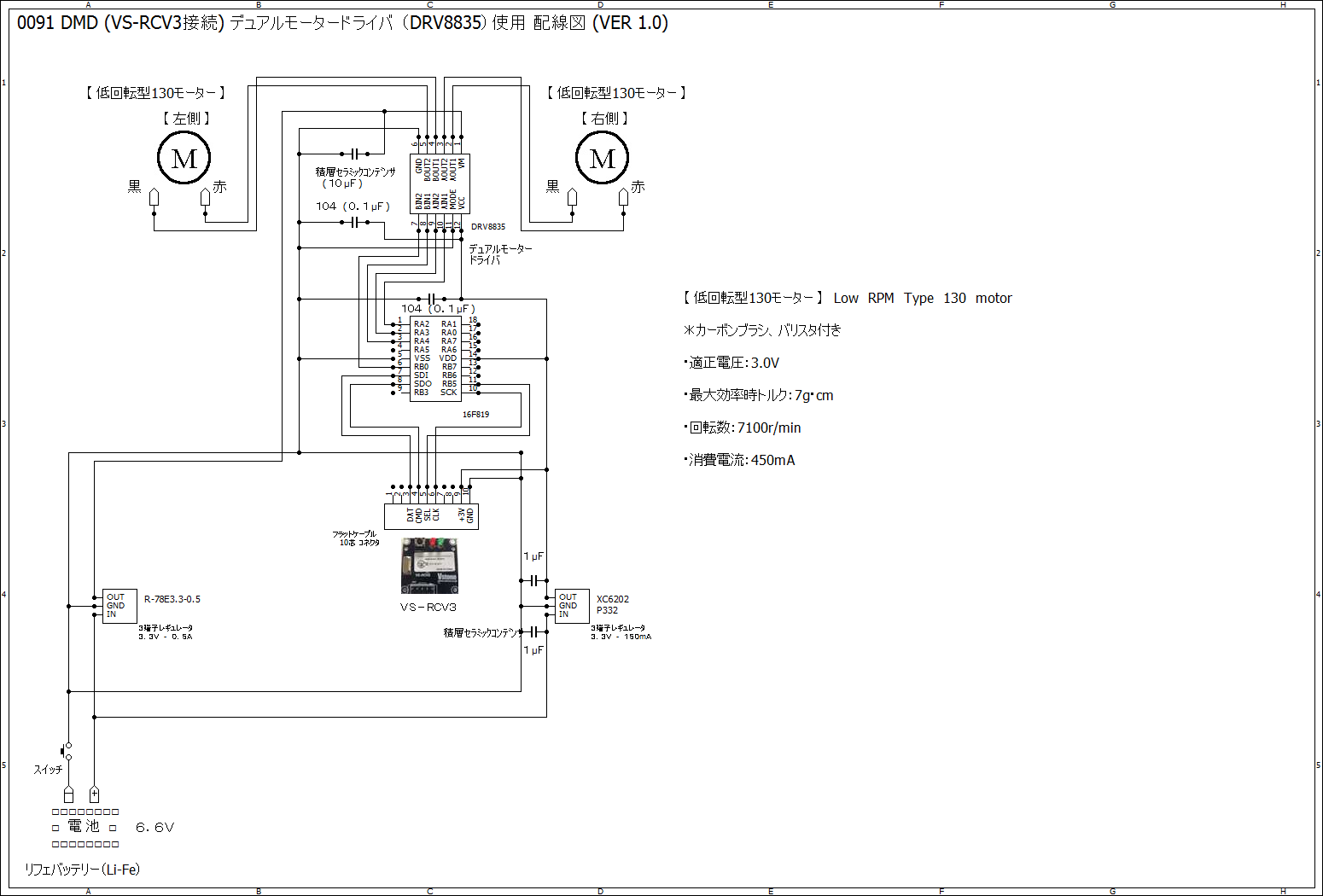 ●配線図のイメージです。……… クリックすれば、拡大します。→ これは、動かしていませんが ……… ノーマルの130モータを回転できるかも?