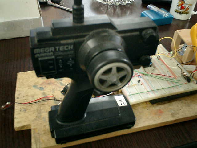ラジコン操作でモーター制御する際には、スイッチ(ON⇔OFF)方式もあるみたい ですが、一般的なラジコンカーなどでは、スピ−ドコントロ−ラ−を用いてモーター制 御を行っています。市販品は、高性能で小型化されていて優れていますので、そのまま 使用すれば良いのですが、スピ−ドコントロ−ラ−の製作に興味がありますので、仮組 み状態のテストボード上で試す事にしました。・・・ ちゃんと、できるかな〜 (^^?