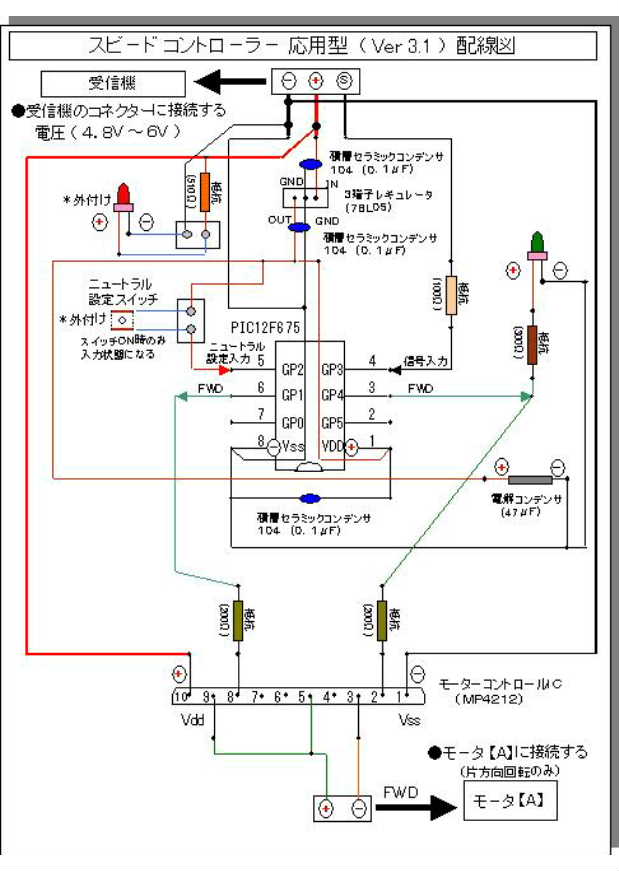 通常のスピコンは、ラジコンの送信機操作により、1つのモーターを'正転・反転'の両方 向にモーター軸を回転させる事ができ、'前進・後進・停止'などの動作及びモーター回転 数の増減制御に用いますが、FWD制御のみの限定動作(片方向回転のみ)で操作を行な いたい時を想定して、応用型のスピコンを、テストボード上で試行する事にしました。