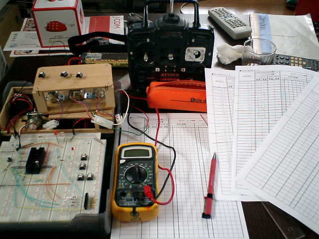 ●基盤は、スピコン 改良型 Ver 2.2(テストボード)を使用します。 私が使用しているプロポ(4チャンネル)ですが、ラジコンボートとして2チャンネルモー ドの操作性を自分好み(右側のステイック<上下>操作)に合わせて、チャンネル配置変更 の改造を行なっていますので、この改造プロポ専用のセッテイングとなる感じです。(^^;