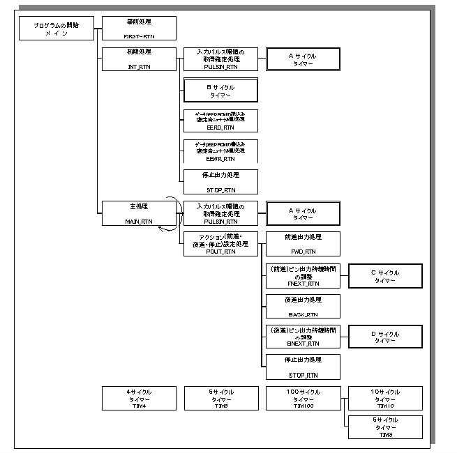 使用PICの仕様では、呼び出し命令(CALL)を利用した時に、呼び出し元に戻る為の アドレスをしまう為のスタックメモリが8レベルまでありますが、割り込み時に1レベル使 いますので、実際には7レベルまでとなります。この制約(最大8レベル)を考慮して、階 層構造化での論理モジュール分割を行っています。