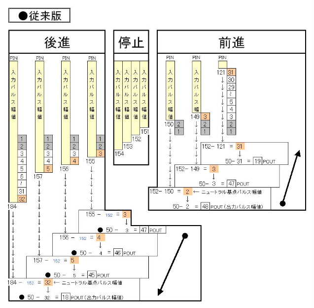 算出基準係数(前進:29,後進:30)での設定となり、出力パルス幅値は低値からの開始です。 → 計算ものは、とても苦手ですので・・・ 結果オ〜ライですね (^^;