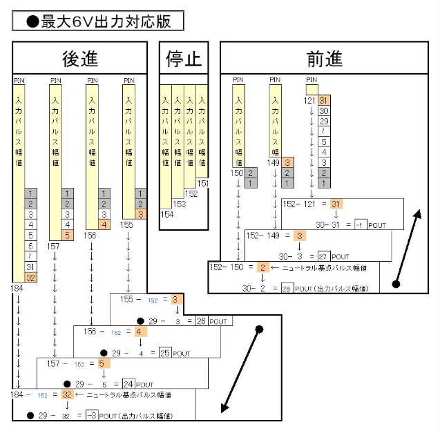 ●(最大6V出力化対応版)出力パルス幅値の推移イメージ図 A型とB型系のプログラムでのセッティングでは、プログラム内の空処理(おおまかなタイ マー処理)を用いて、最大出力電圧に近づける調整方法により、単独パターンで決まる感じ ですが、この出力パルス幅値でのセッティングでは、求める最大出力電圧に近似するケース が複数パターンで特定できました。これらの複数候補から選出となりましたので、セッティ ングとしての選択肢が、新たに、増えた事になります。 また、特定の複数パターンは、個々に特性(クセ)がありますので、この特性(クセ)傾向 を意識しながらの選択が行なえました。これにより、プロポのスティックによるアクセル操 作に反応するモーター回転の強弱動作が、自分好みのセッティングに仕上がった感じです。
