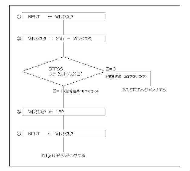 ●追記したプログラムステップです。 MOVWF NEUT ;NEUT ← Wレジスタ ;---ニュートラル値(NEUT)の省略値(152)をセットする SUBLW D'255' ;Wレジスタ = 255(H'FF')− Wレジスタ BTFSS STATUS,Z ;ステータスレジスタ(Z)=1(演算結果:ゼロである) ;次の命令をスキップする GOTO INT_STOP ;ステータスレジスタ(Z)=0(演算結果:ゼロでないので) ;INT_STOPへ ジャンプする MOVLW D'152' ;Wレジスタ ← 152(省略値) MOVWF NEUT ;NEUT ← Wレジスタ GOTO INT_STOP ;INT_STOPへ ジャンプする