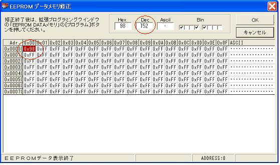 ●PIC内部(EEPROM)のデータ内容です。 このプログラムでは、簡略化により入力パルス幅値を1バイト(8ビット)で、取り扱ってい ますので、これに伴い、ニュートラル値も同様に1バイト(8ビット)での使用になります。 ニュートラル値(設定後)の保存場所は・・・ EEPROMの先頭1バイト目(ADDRESS:0)に、最大値(255)内で格納されてます。 ---------------------------------------------------------------------------------- ■PICに組み込んだ直後の初期状態です。