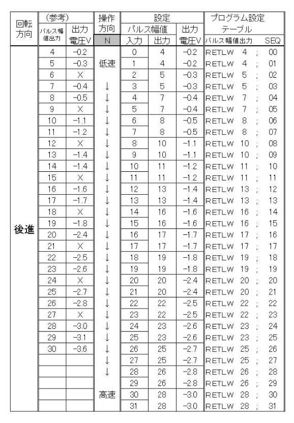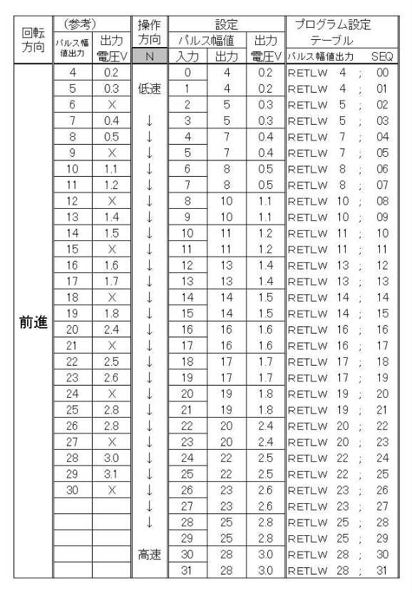 ●出力パルス幅値テーブルの設定表です。(3.0Vモータ用基本版の場合) 自分なりの試行では (^^;・・・ こんな感じで推移しました。