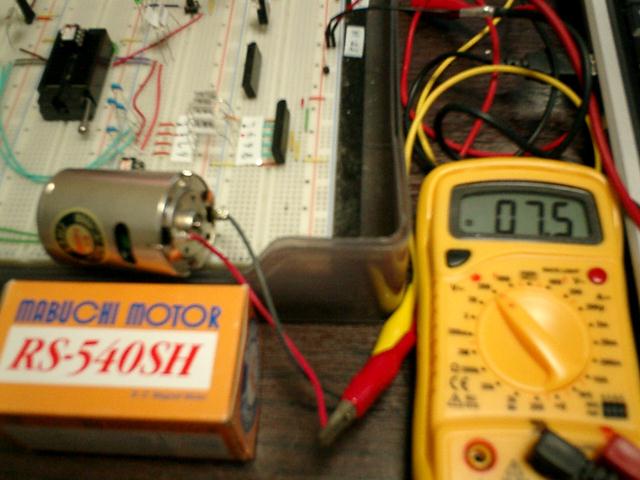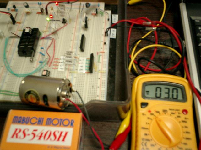 自作の試行スピコンで3Vモ−タを、なんとなく動かすことはできましたが、大きなモ−タでは まったく動きませんでした。何故かと思い、色々と調べてみましたら試行スピコンで使用してい るFETアレイ(MP4212)は、最大ドレイン電流(連続)が5Aで、大きなモ−タを動か すのに必要な電流が不足していた感じです。 大きなモ−タも動かしてみたいので、試行することにしました。