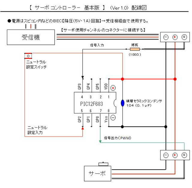 ■プログラムは・・・ スピコンではラジコン操作からの指示により、前進、後進、停止の動作制御をしていました が、このサーボコントローラでは、左方向、右方向、ニュートラル位置で固定停止させ維持 するなどの動作制御に組み替えてのプログラム作りです。 ・ニュートラル位置・・・【 ステイック:センター 】【 トリム:センター 】 ------------------------------------------------------------------------------ ・SATBVA01( VER 0A.01 ) サーボコントローラ 基本版 ------------------------------------------------------------------------------ 【 PIC12F683 】 __________ __________ | V | | | 3〜5V+ --+ 1 Vdd(+) | Vss(-) 8 +-- 0V --+ 2 GP5 |OUT GP0 7 +-->サーボ --+ 3 GP4 | GP1 6 +-- サーボ-->+ 4 GP3 IN | GP2 5 +--< SW.NEUTRAL | | +---------------------+ ■ちょっと、試したいことがあるので、改良版を作りました。 ・ニュートラル位置・・・【 ステイック:センター 】【 トリム:センター 】 ------------------------------------------------------------------------------ ・SATBVB01( VER 0B.01 ) サーボコントローラ 改良版1 追加機能:ニュートラル位置での、サーボ動作(左右方向)の自動制御 ニュートラル位置内では、サーボが自動的に(時間周期・動作)設定範囲内で 左右方向に動く。約1秒間隔で次の動作をするので、それぞれの動作方向の最 大位置までの途中停止箇所の移動動作変化が目視できる。 ------------------------------------------------------------------------------ ・SATBVC01( VER 0C.01 ) サーボコントローラ 改良版2 追加機能:SATBVB01の高速動作版 速い時間の間隔で次の動作をする。この改良により、それぞれの動作方向の最 大停止位置までの距離が狭くなった。サーボは激しく動くので壊れるかも? ------------------------------------------------------------------------------