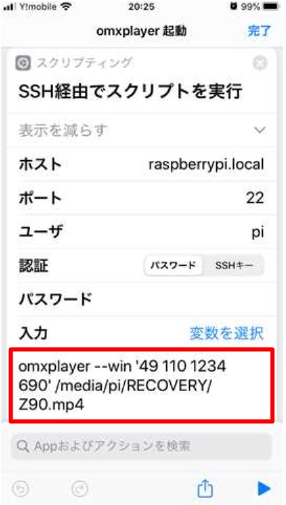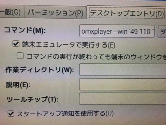 ・入力項目に設定しているコマンドです。 omxplayer --win '49 110 1234 690' /media/pi/RECOVERY/Z90. mp4