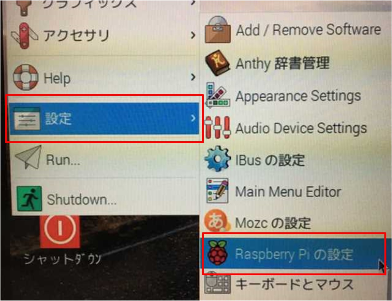 ●スタートメニューから 【 設定 】 → 【 Raspberry Pi の設定 】 をクリックします。