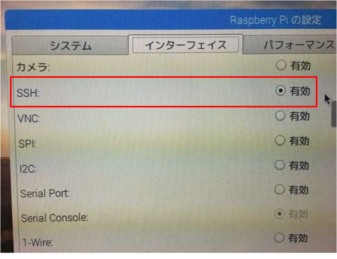 ●事前に、ラズパイ側での設定作業があります。 SSH ( Secure Shell ) ……… 【 有効 】 にします。