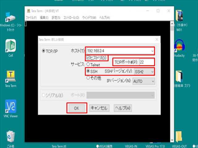 ●「 Tera Term 新しい接続 」画面で、接続情報を入力します。