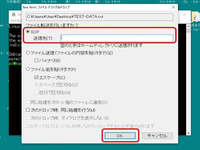 → 【 OK 】 ボタンを押下する。 ・SCP : チェックする ・送信先 : 空 ( この場合は、ホームディレクトリに送信します )