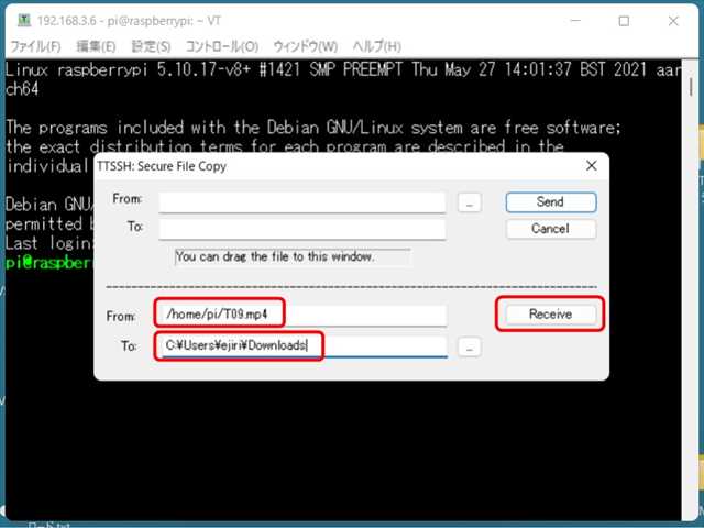 ●下部欄の項目に入力する。 ・From : ダウンロードする … ラズパイのファイル名 ・TO : ダウンロード先の … パソコンのフォルダ名