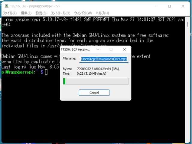 ・ ・ ●次に、パソコン 「 Tera Term 」操作で …… ・ ・ ・ ダウンロード ( ラズパイ → パソコン )します。 ・