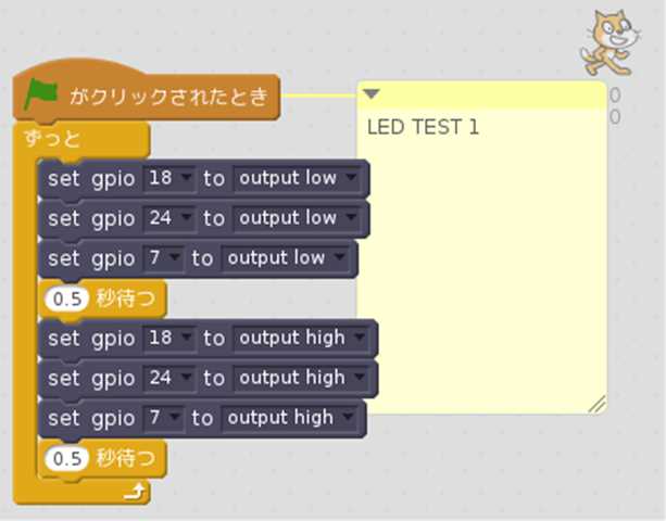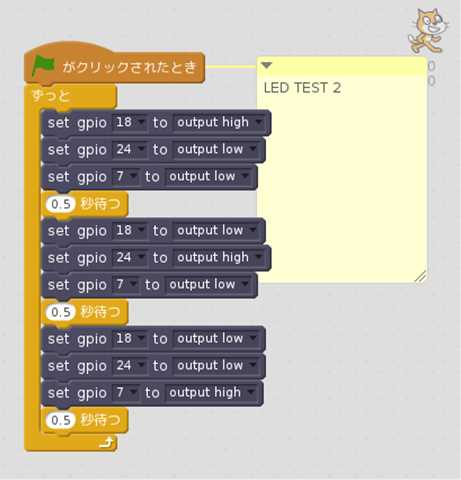 ● Scratch( スクラッチ ) ……… LED点滅 ( チカチカ ) 処理 テスト A ・LEDを 0.5秒間隔で、順次点灯する ( GPIO18 → GPIO24 → GPIO7 )